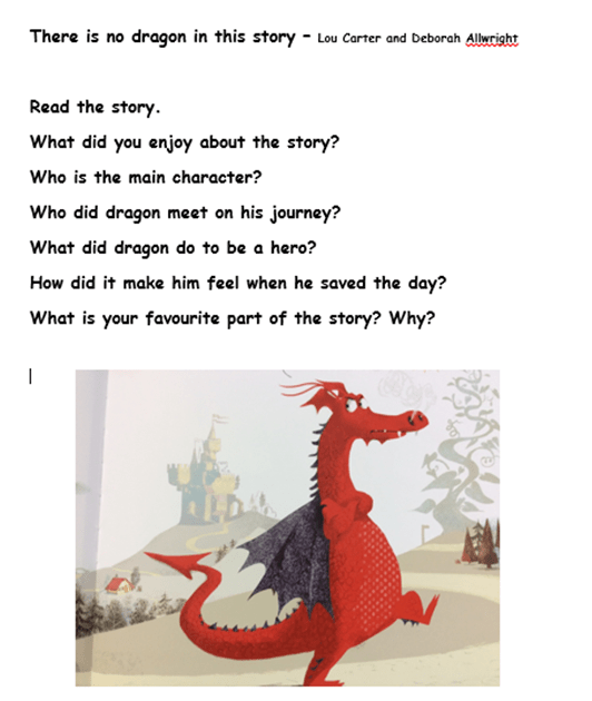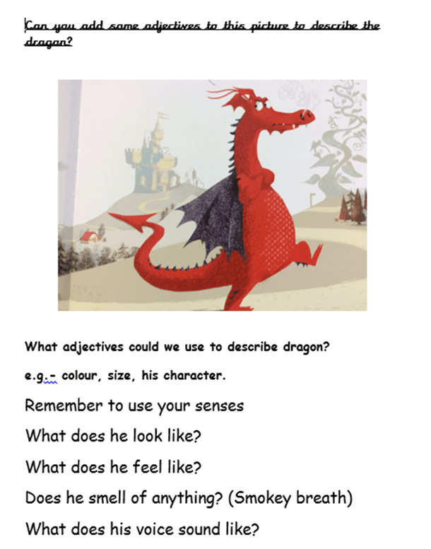 Once you have listened to the story, can you use the picture to list some adjectives for the dragon to describe him.