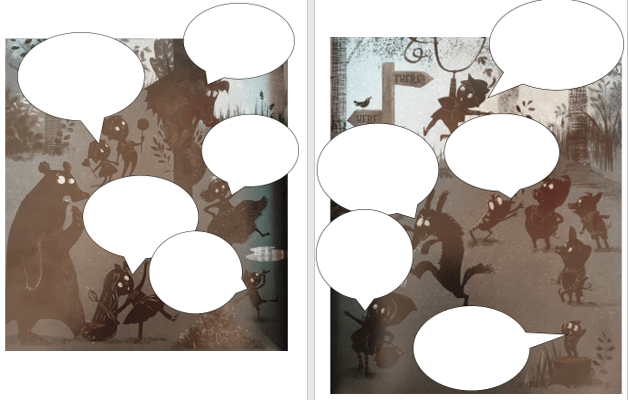 Yesterday you had a go at writing speech bubbles for the dragon. Today we would like you to have a go at writing speech bubbles for other characters in the story. The giant has just blown out the sun in this part of the story. How might the characters be feeling? What do you think they would say?