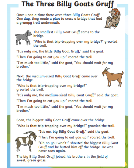 Have a go at reading the story of the Three Billy Goats Gruff together with a grown up.