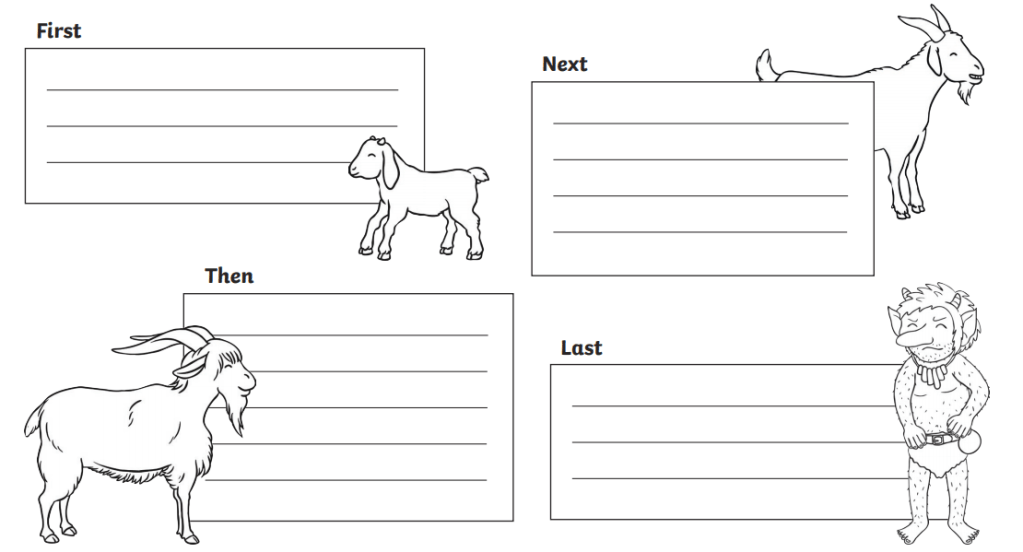 Can you write sentences to sequence the story or tell your grown up what happens in the story using the words first, next, then and last?