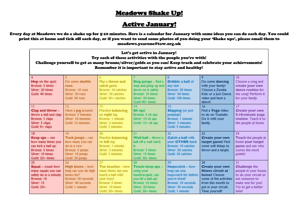 Miss Brentnall has put together a calendar of quick activities and challenges you could do each day throughout January to keep active.