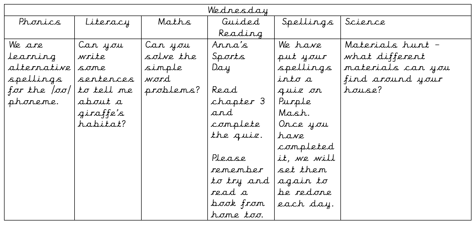 If you need any additional support please contact us between 8.50am-4.00pm via our year group e-mail. We will try to respond as quickly as possible. Also, if you would like to share any work, please e-mail it to the same e-mail address.