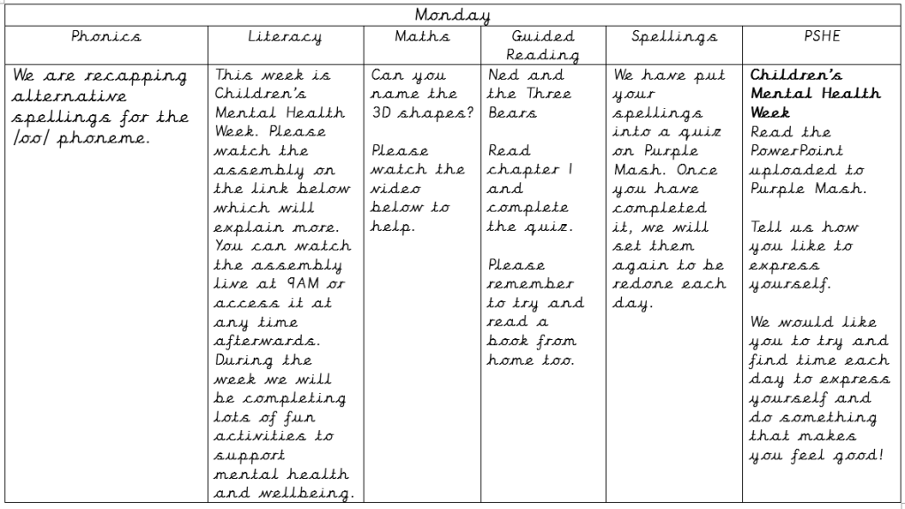 If you need any additional support please contact us between 8.50am-4.00pm via our year group e-mail. We will try to respond as quickly as possible. Also, if you would like to share any work, please e-mail it to the same e-mail address.