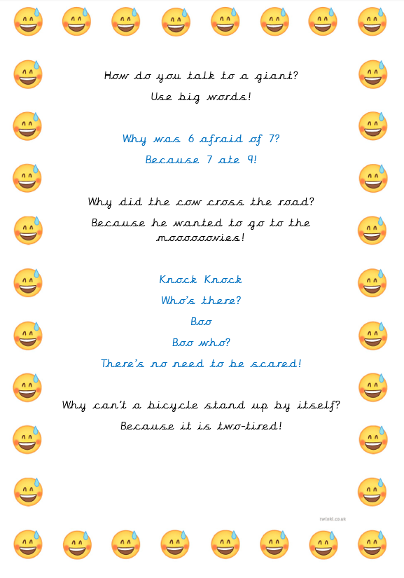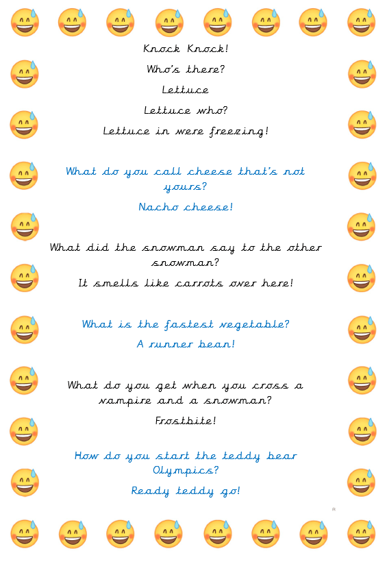 Thank you for your fantastic jokes yesterday Class 3 and 4! They really made us laugh and we thought you might like to see some of them too…