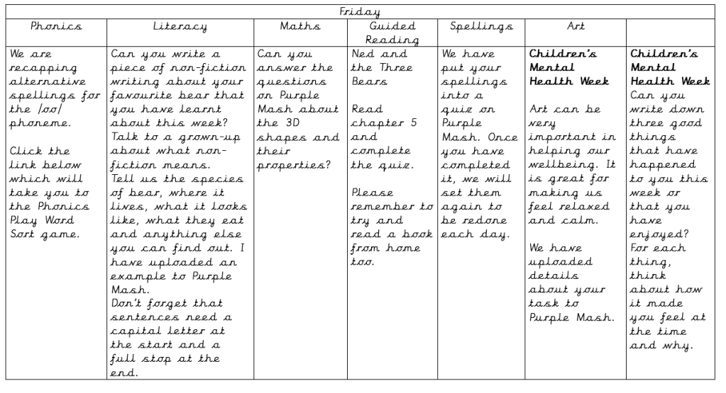 Wow we are at the end of another fabulous week of home learning. We have been amazed with your work, especially the work you have done related to Children’s Mental Health week, your jokes really made us laugh! We know it’s difficult for you all working at home but we really are very proud of you all!
