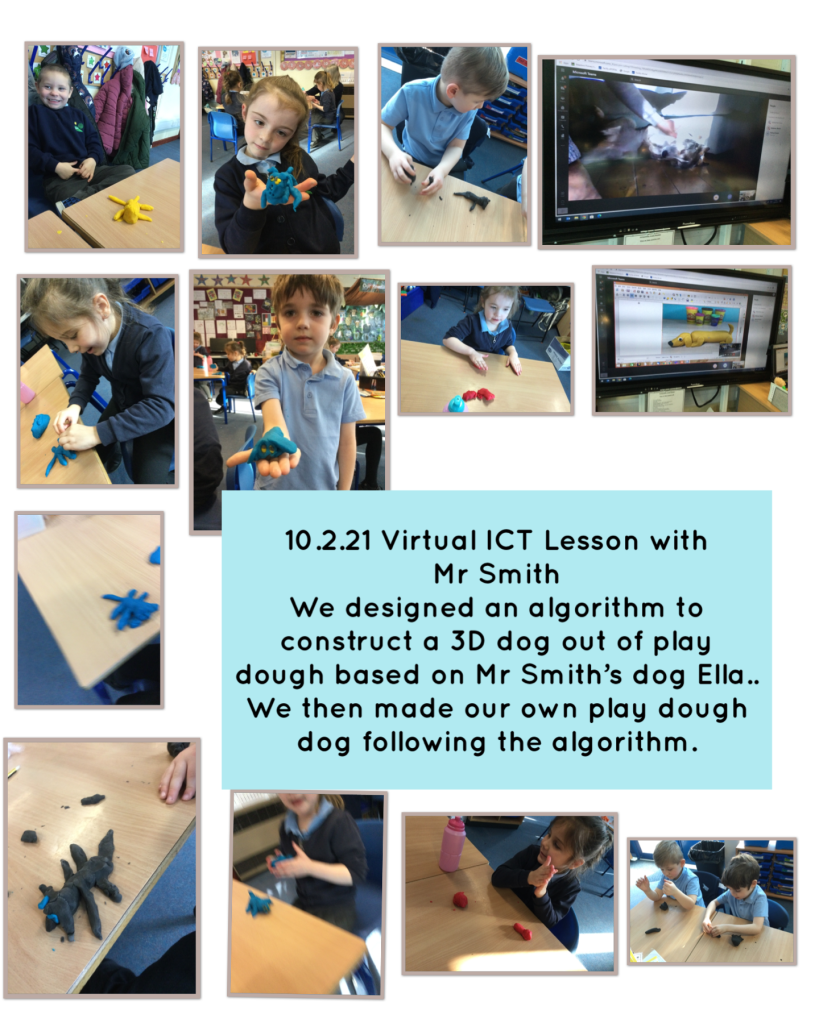 Posted on 10th Feb 2021 by Year One We designed our an algorithm to construct a 3D playdough dog then followed it to make our own. Share this: Share on X (Opens in new window) X Share on Facebook (Opens in new window) Facebook Like Loading... Related