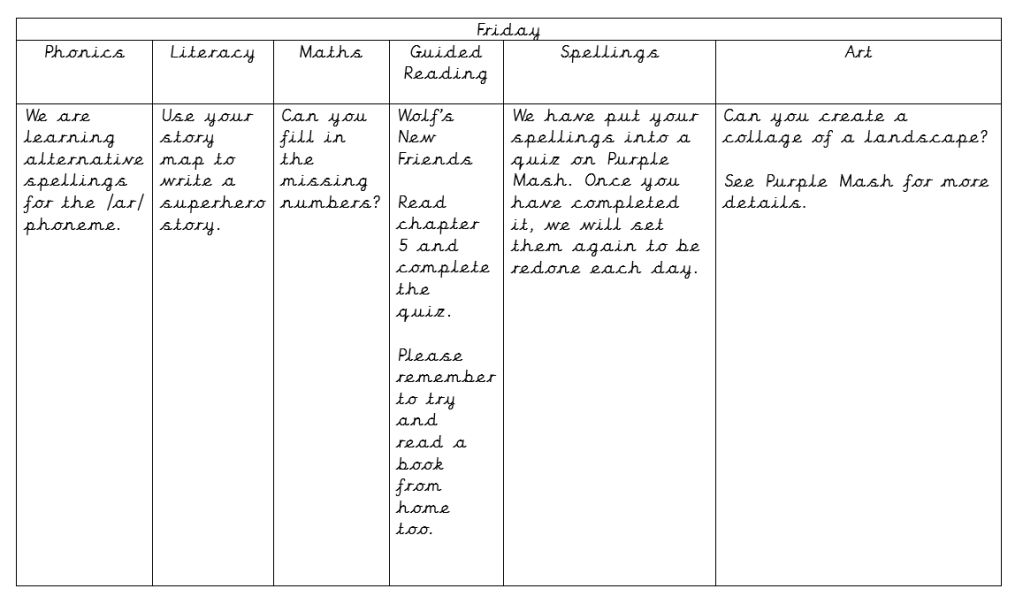 If you need any additional support please contact us between 8.50am-4.00pm via our year group e-mail. We will try to respond as quickly as possible. Also, if you would like to share any work, please e-mail it to the same e-mail address.