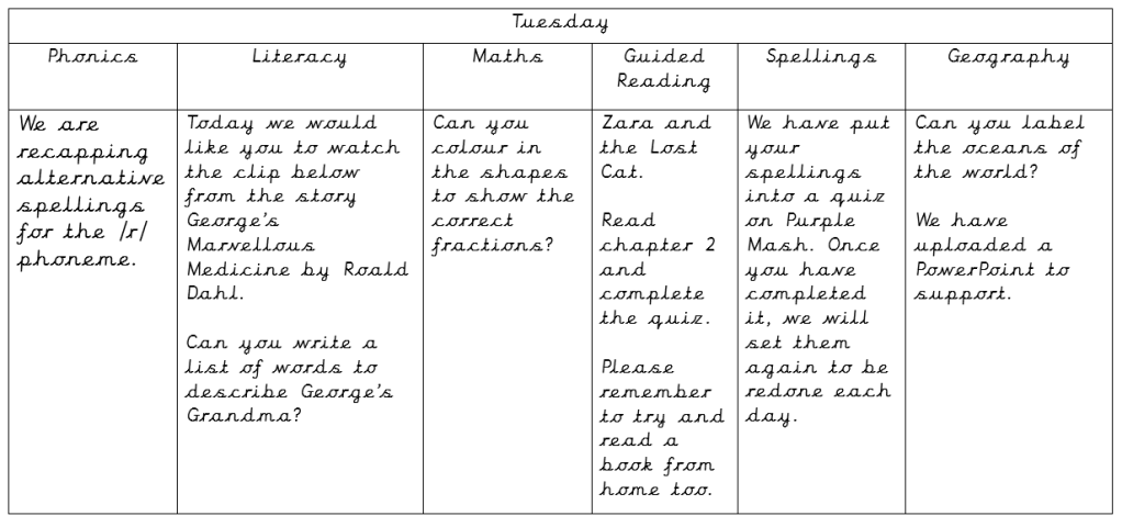 If you need any additional support please contact us between 8.50am-4.00pm via our year group e-mail. We will try to respond as quickly as possible. Also, if you would like to share any work, please e-mail it to the same e-mail address.