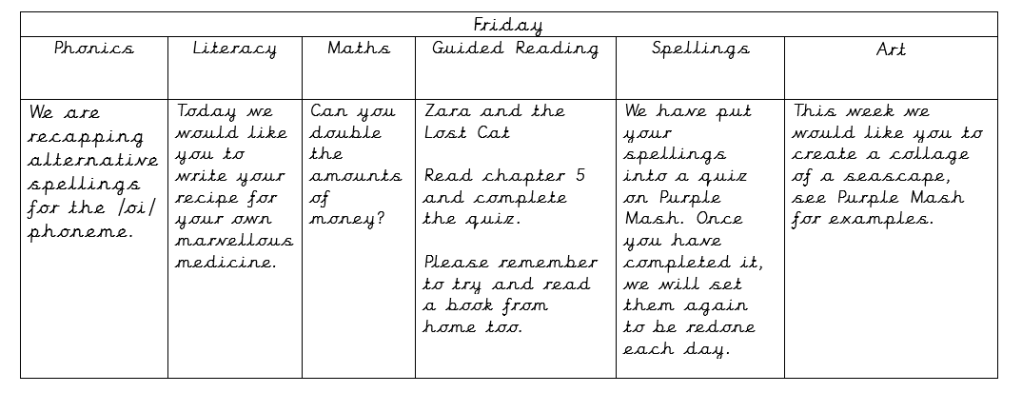 Have a super last day of home learning and we will see you on Monday! 🙂 🙂 🙂