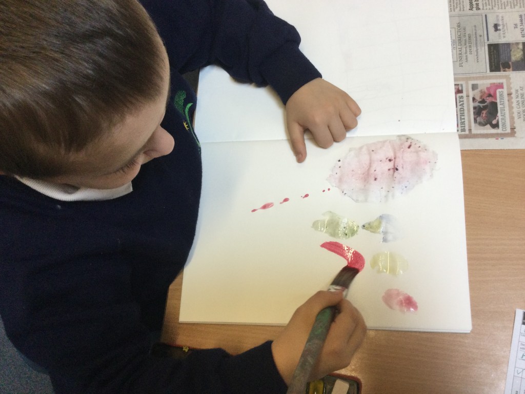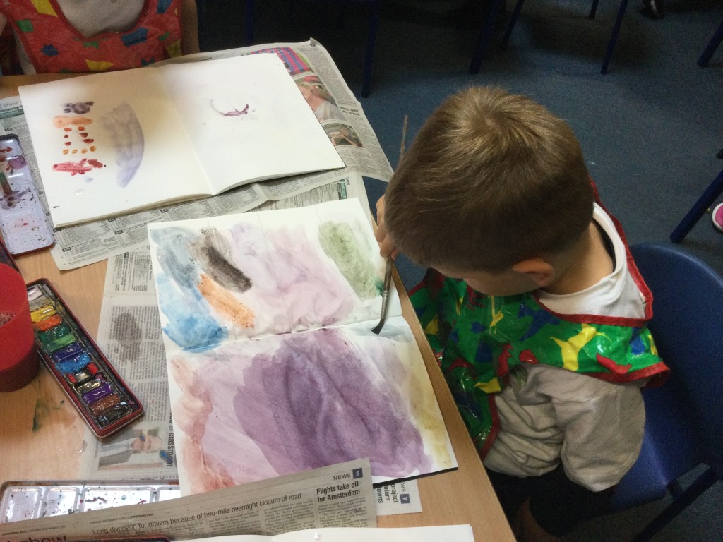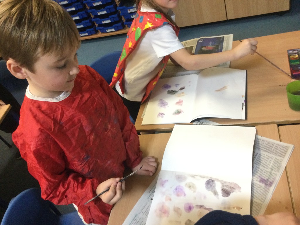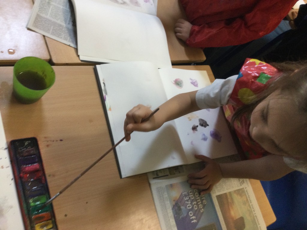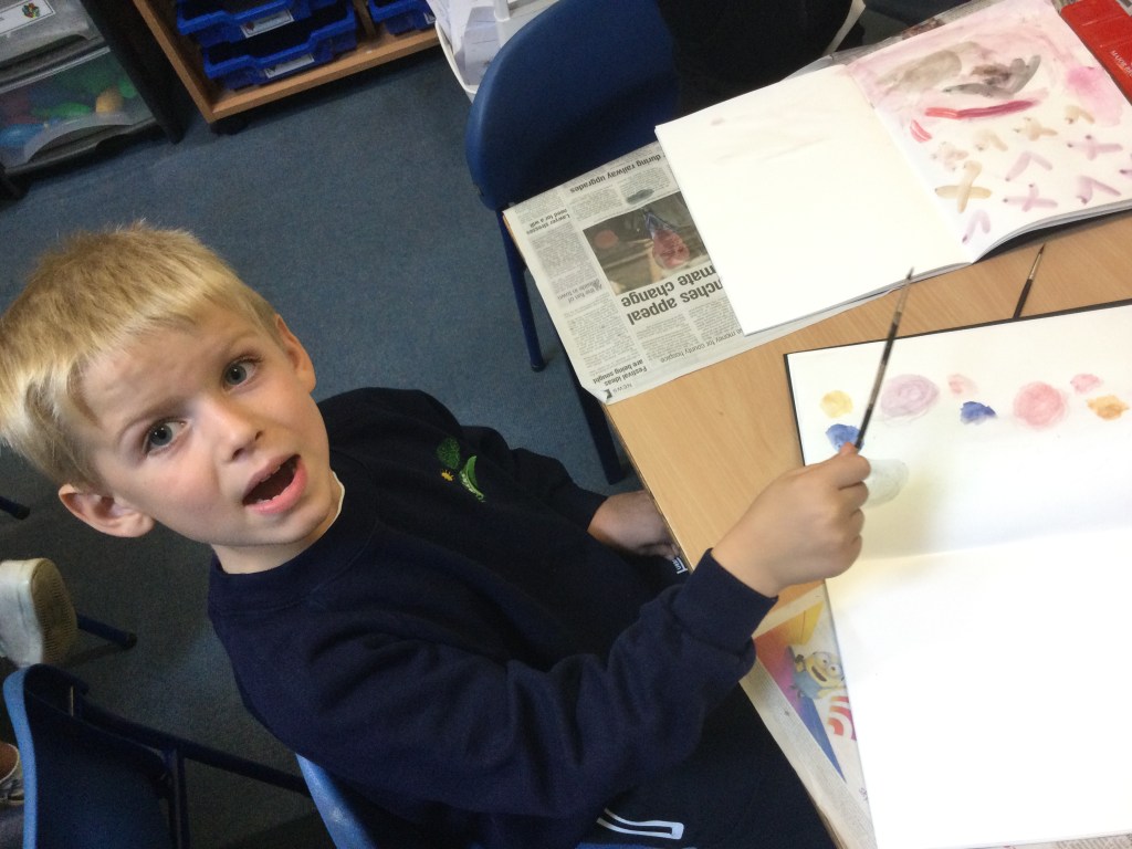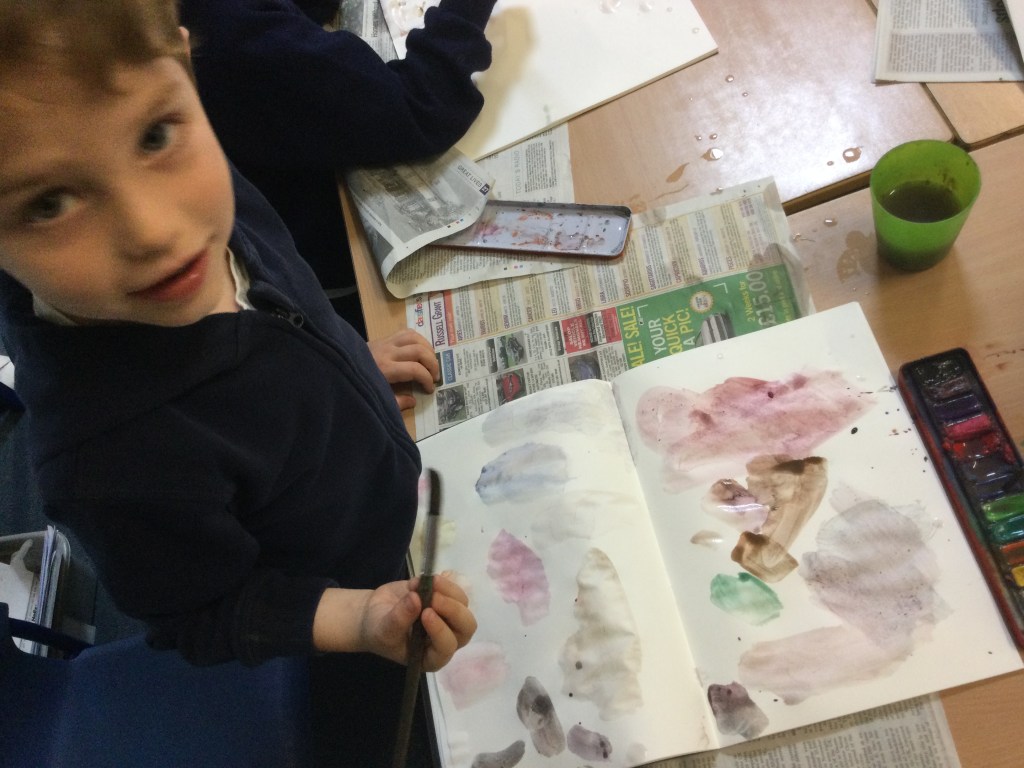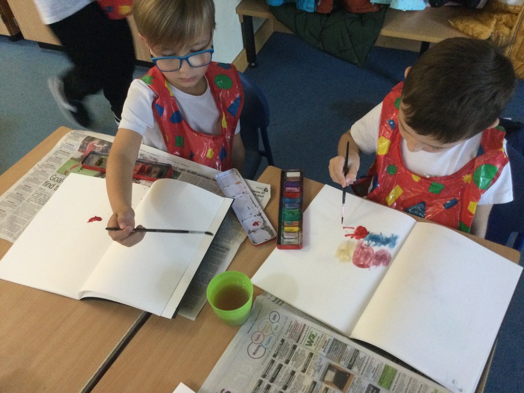 Today we used water colours. We talked about how to use a fine paint brush lightly and how to care for them. We mixed red, yellow and blue to see what other colours we could make. We then had free rein to explore and colour mix in our sketch books, creating new colours and presented them it in our own way.