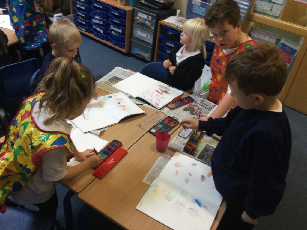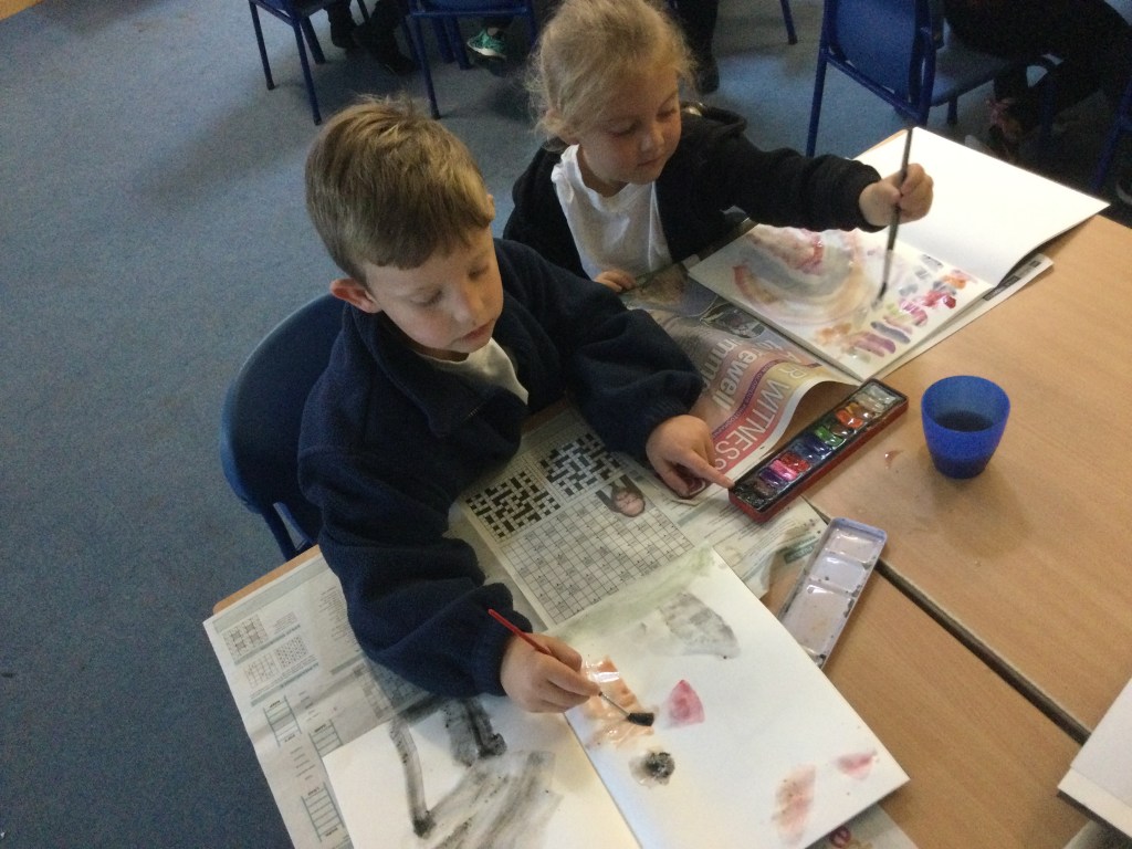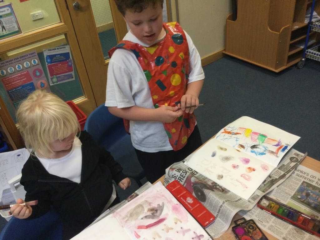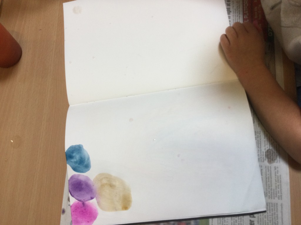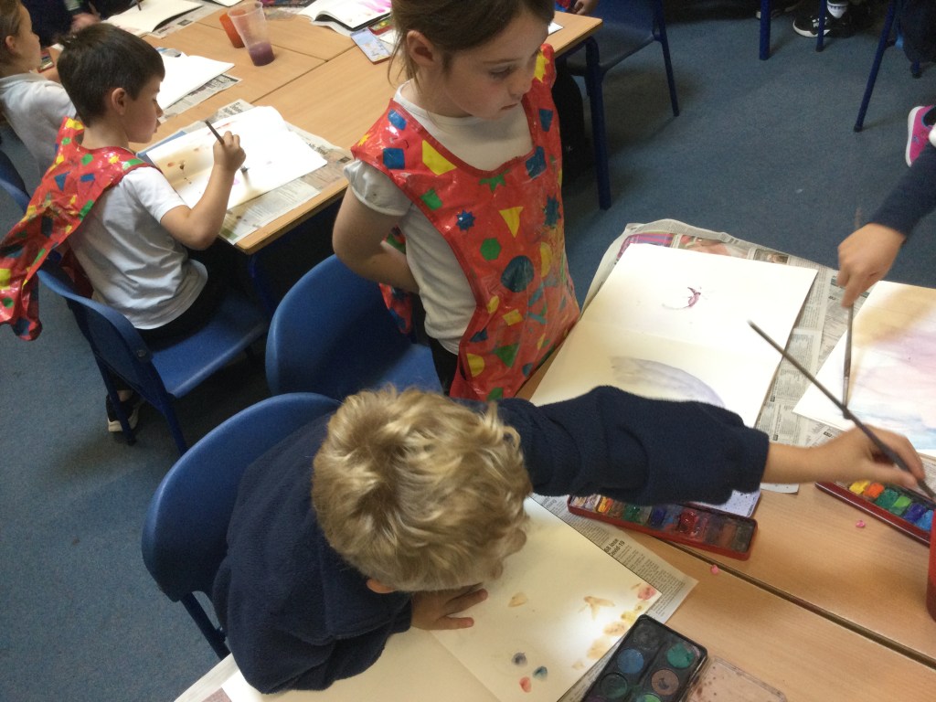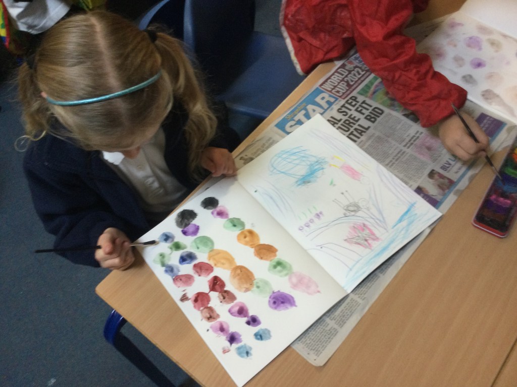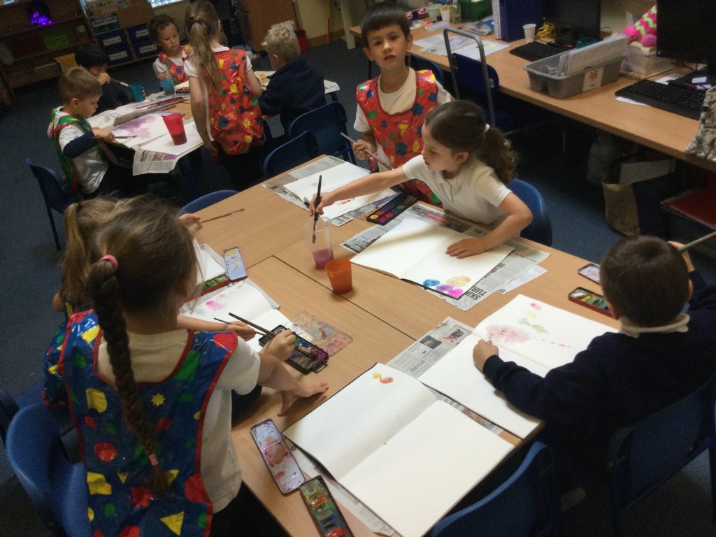 Today we used water colours. We talked about how to use a fine paint brush lightly and how to care for them. We mixed red, yellow and blue to see what other colours we could make. We then had free rein to explore and colour mix in our sketch books, creating new colours and presented them it in our own way.